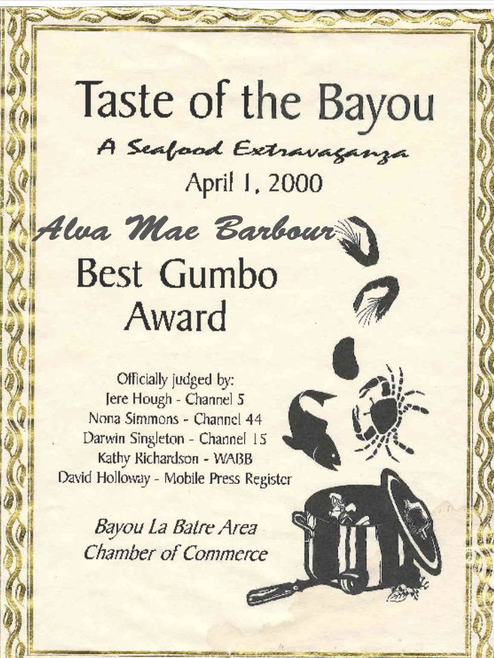 "Alva Mae Barbour, Best Gumbo Award...Bayou La Batre Area Chamber of Commerce"